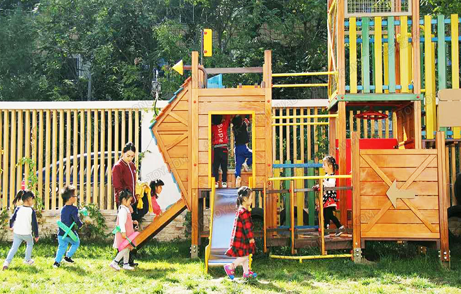 • 该幼儿园采用的是非标定制的木制产品,整套产品设计独特、颜色艳丽,非常美观的融入到整个幼儿园的娱乐场地,是集攀爬、滑梯、爬网、万能健身为一体的综合性游乐项目,让小朋友在玩耍的同时身体也得到了锻炼。