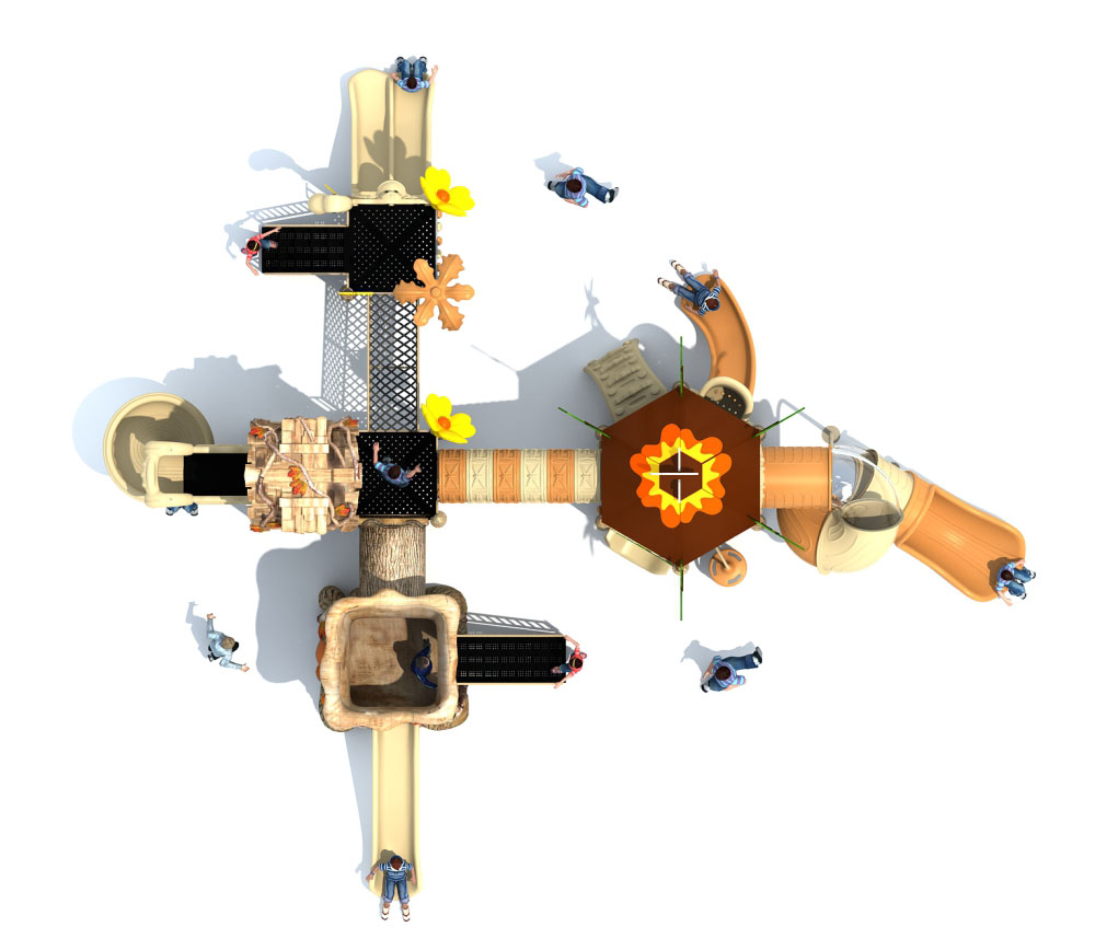 • 远古部落系列虽然名字带着“古”字,但是在设计细节处无不透露着艺术与创造性。当孩子在仿真树中探索、冒险、嬉戏游玩时,就像穿越到古老的神秘森林;粗略的树干包围着他们,头顶是高耸的茅草屋,触感真实的枯枝走廊,还有随处可见的小动物们…… 远古部落系列旨在打造区别于其他系列带给孩子们的新鲜感,让孩子们找设计者打造的神秘世界中获得冒险的乐趣。