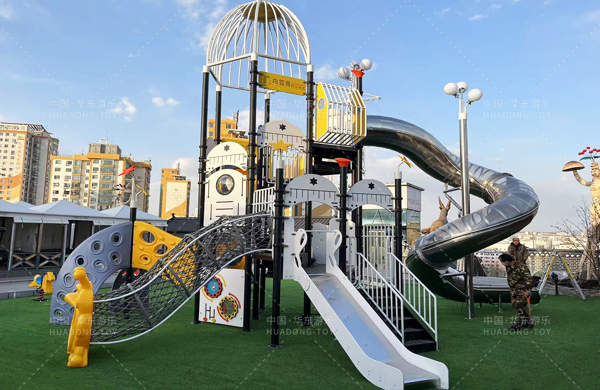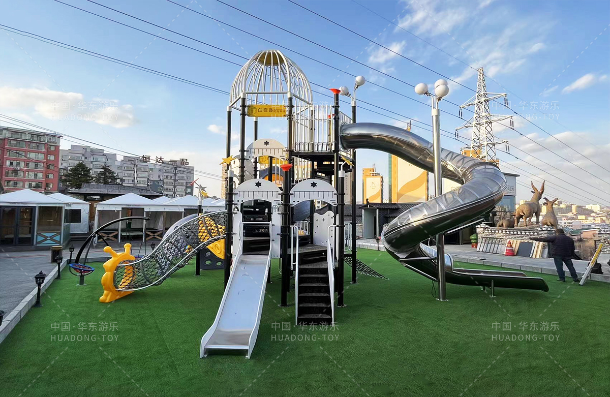 吉林省白雪香民俗烧烤城是一个专业的休闲夜宵烧烤城,此次选用的是leyu·乐鱼(中国)体育游乐自主研发和设计的 PE板系列滑梯,卡通的造型,齐全的功能深受小朋友们的喜爱,同时还设置了小朋友喜欢的儿童摇摇乐、组合秋千、 旋转碗等游乐设备。